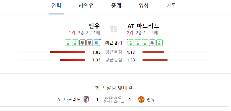 최근 맨유는 2승 2무 1패의 전적을 보이고 있고 AT마드리드는 4승 1 무의 성적을 거두고 있습니다. 아틀레티코 마드리드가 최근 기세는 좋습니다. AT마드리드 홈에서 열린 챔피언스리그 16강 1차전은 무승부를 거두었습니다.