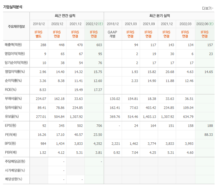 2022년 연간 매출액과 영업이익은 603억, 95억원으로 전년대비 증가할 것으로 예상됩니다.
