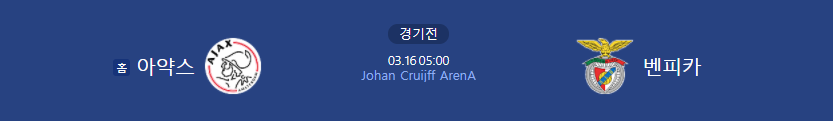 3월 16일 05:00(한국시각) 아약스 VS 벤피카의 챔피언스리그 16강 2차전 경기가 아약스 홈에서 열립니다.