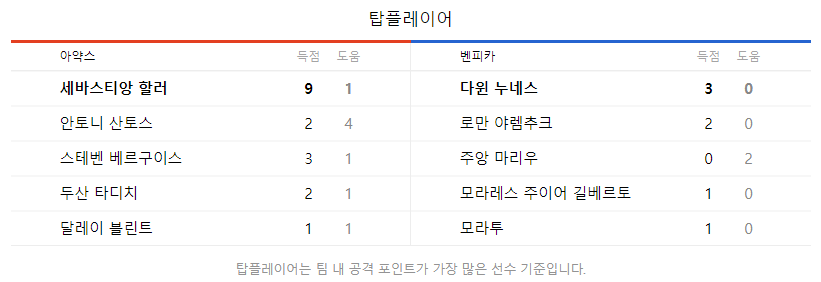 주요 플레이어로는 아약스에서는 할러, 벤피카는 누네스가 있습니다. 할러는 9 득점으로 상당히 높은 득점을 올리고 있으며 이번 경기에서도 가장 기대되는 플레이어입니다.