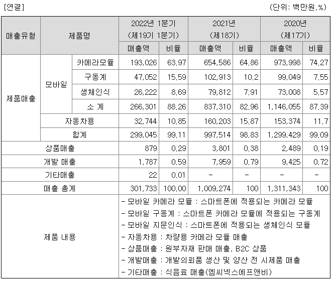 휴대폰에 적용되는 카메라 모듈은 2000년부터 휴대폰에 장착되기 시작하여, 언제 어디서나 간편하게 사진을 찍고, 보고, 전송할 수 있다는 장점으로 휴대폰 시장과 함께 성장 하였습니다