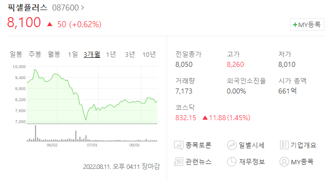 픽셀플러스 주가는 8월 11일 기준 8,100원입니다.
