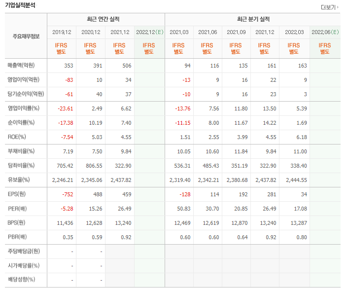 2022년 연간 실적은 매출액 623억원(+23.1% YoY), 영업이익 37억원(+11.2%) 예상. 2022년 연간 영업이익률은 6.0%(-0.6p% YoY)을 예상합니다.